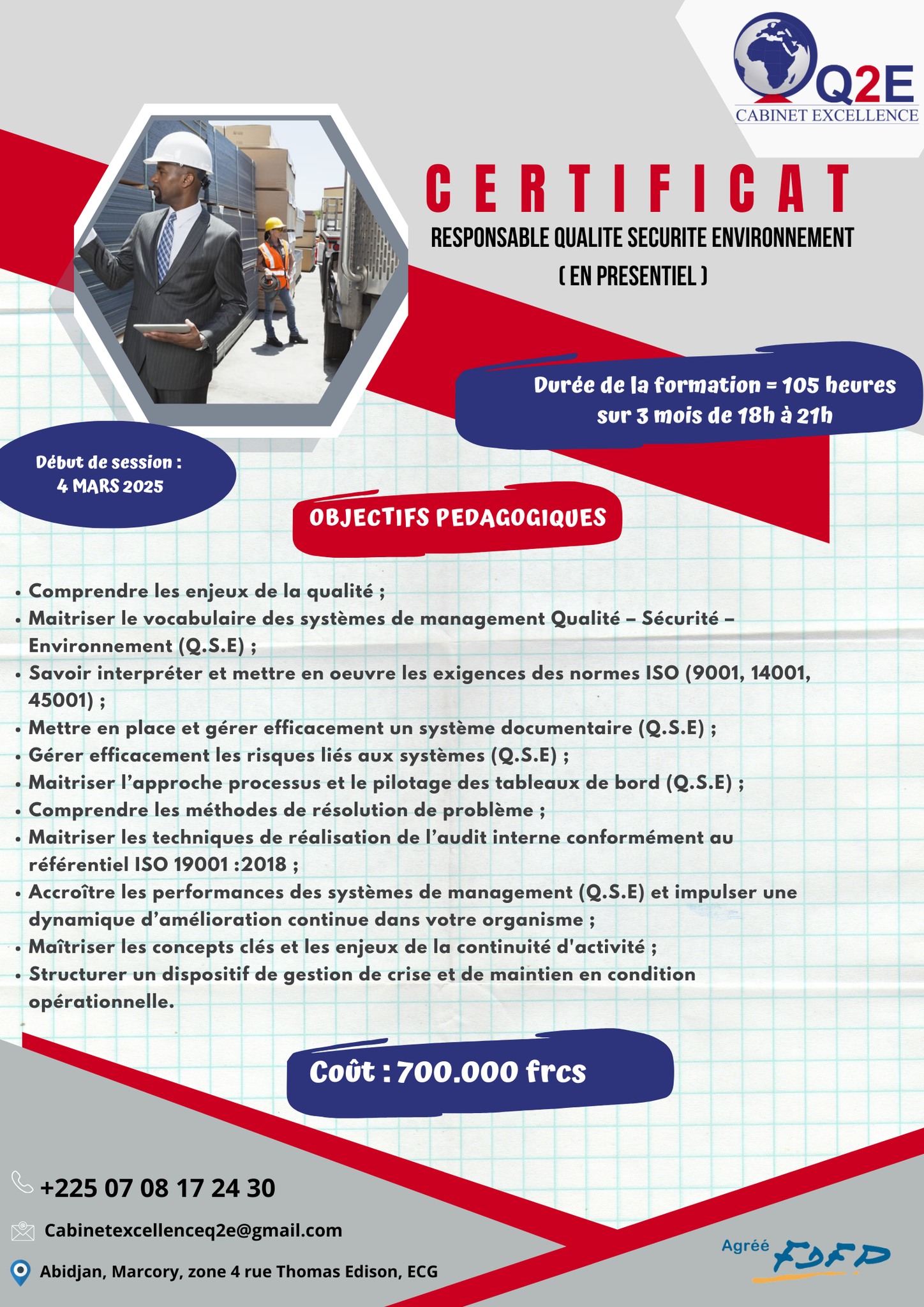 Cette initiative s'inscrit dans une volonté de renforcer la performance et l'efficacité des structures dédiées à la protection de l’environnement en Côte d’Ivoire. Pour mener à bien cette démarche stratégique, le Cabinet Excellence Q2E a été sélectionné afin d’accompagner l’ANDE et le CIAPOL dans la mise en place d’un Système de Management de la Qualité (SMQ) conforme aux exigences de la norme ISO 9001 : 2015.